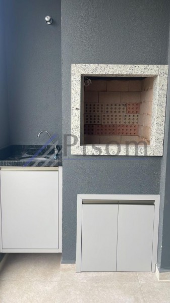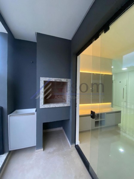 A sacada é um grande diferencial, equipada com churrasqueira a carvão, bancada em granito, armário de apoio e esquadrias em alumínio, ideal para momentos de lazer e convivência.